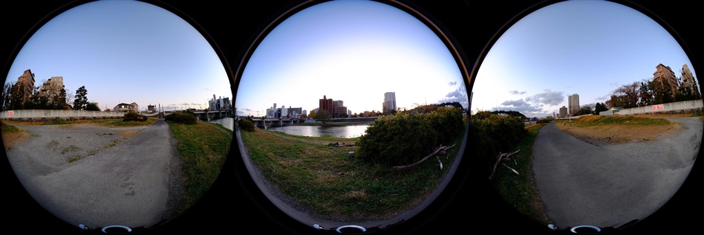 まず魚眼で水平方向120°おきに素材を撮影(実際は加えて下向きも)