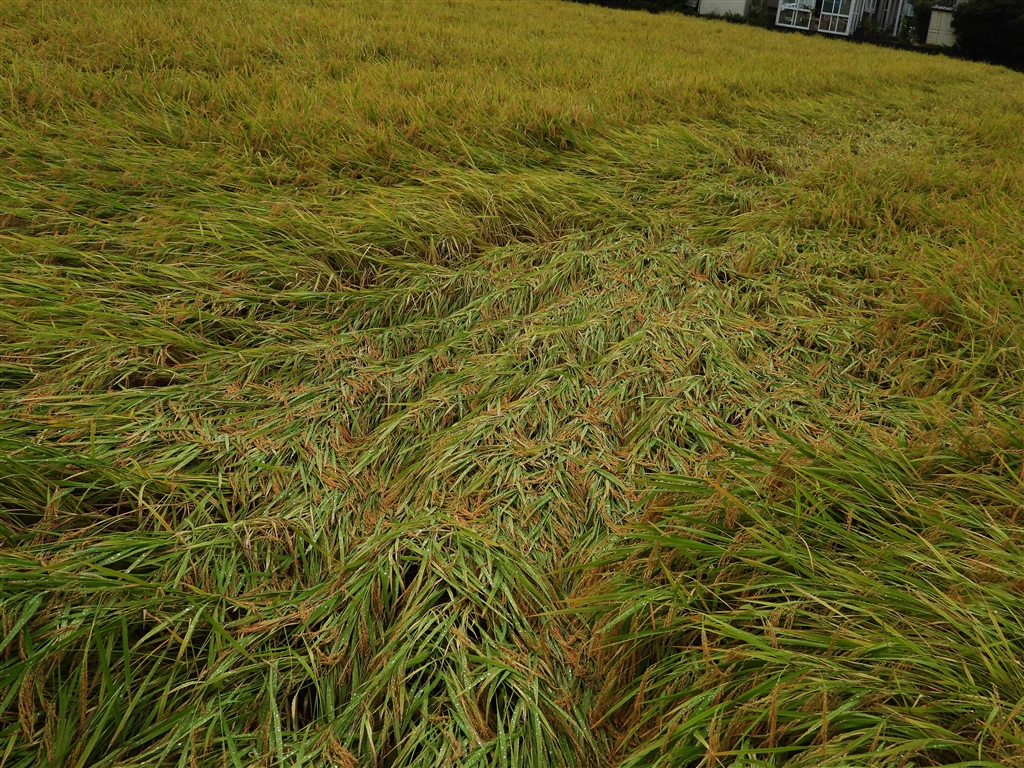 雨で潰れた稲、刈り取りに難渋します