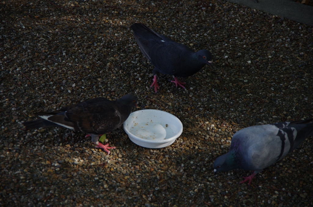 猫が残したご飯をあさるハト。。気づいたらお皿空っぽでした。