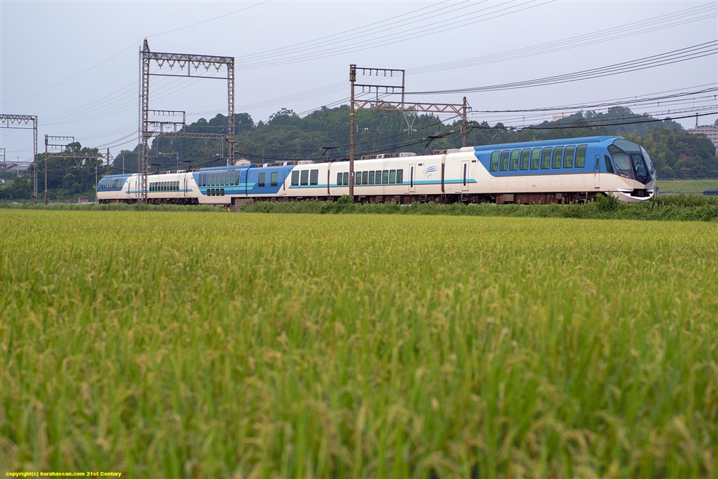 キレキレマクロで、プレミアムな特急が走る水田を撮影。