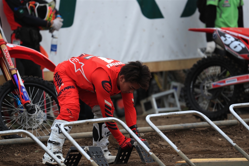 自らスタートグリッドを均す横山君
