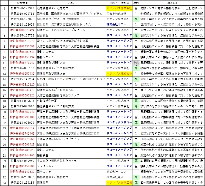 アストロトレーサー関連とりあえず33件(^^; 2000年出願以降