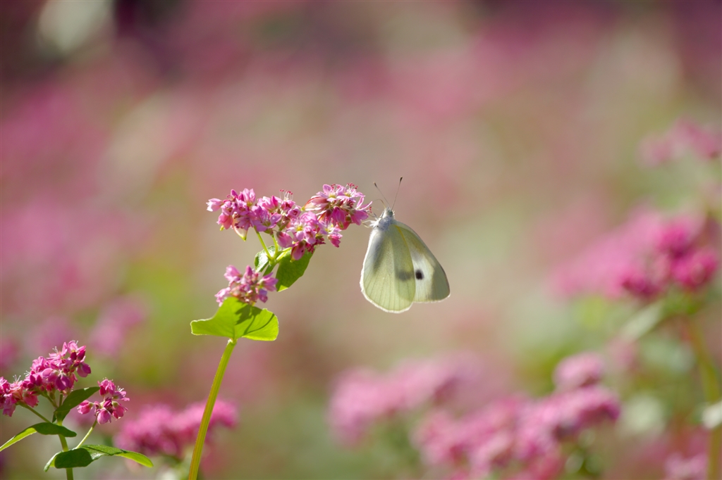 赤そばの畑で遊ぶモンシロチョウ