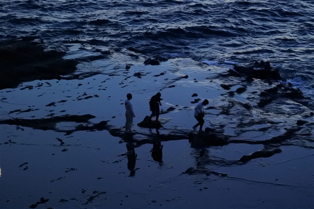 稚児が淵の磯を歩く観光客(ボケボケです)