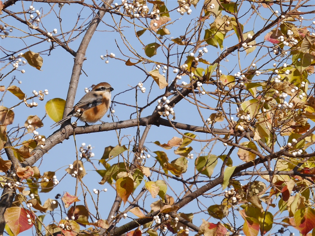 小さな鳥がぴょこぴょこと動く、ナンキンハゼの実を食べている模様…モズですね。