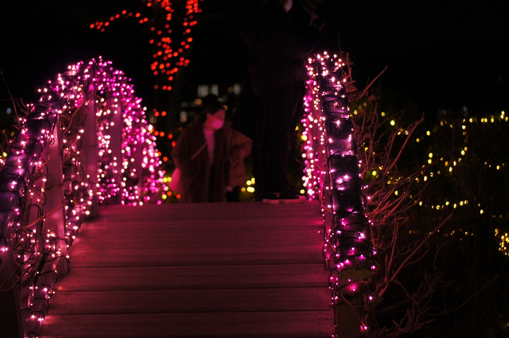 太鼓橋はピンクに飾らてています。