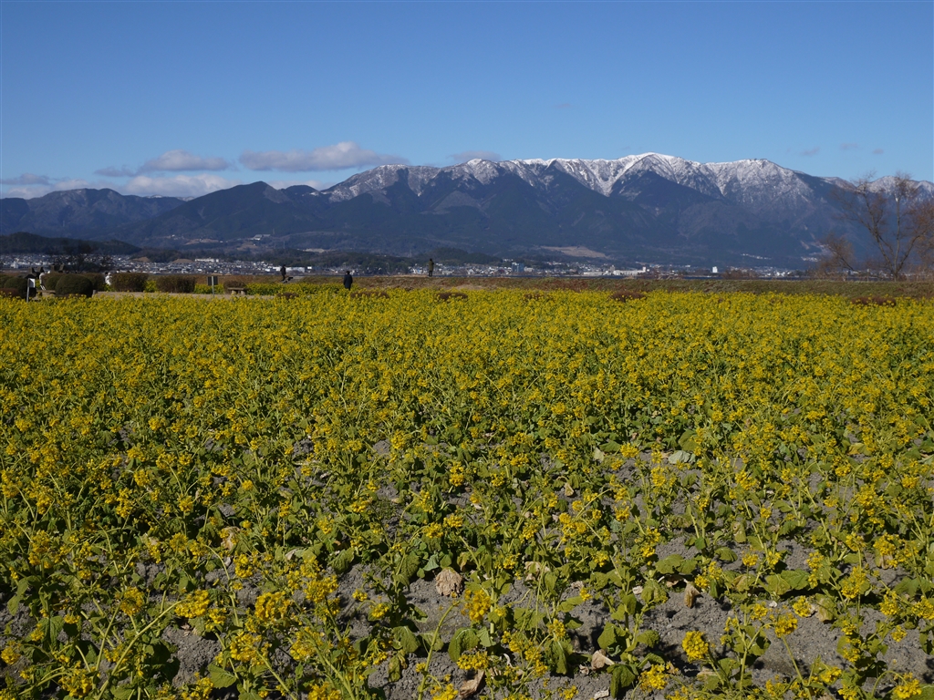 雪化粧した比良山系の山々を背景に。