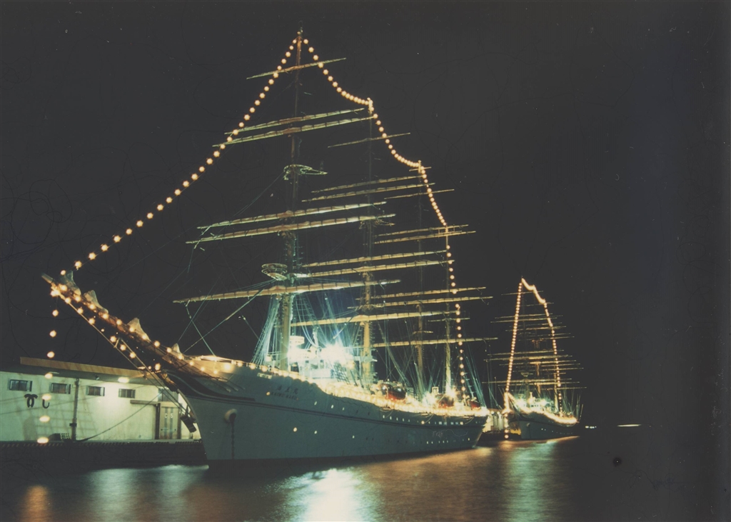 日本丸、海王丸の並んだ夜景、神戸で生まれた海王丸