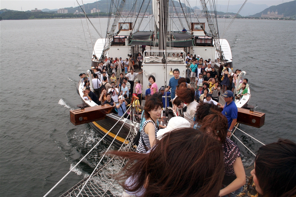 男女に分かれて舳先のネットへ搭乗タイム。今思えば下は海・・・。