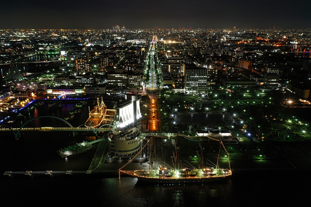 日本丸寄港時の名古屋市内夜景と^^ 左手は観測船フジ