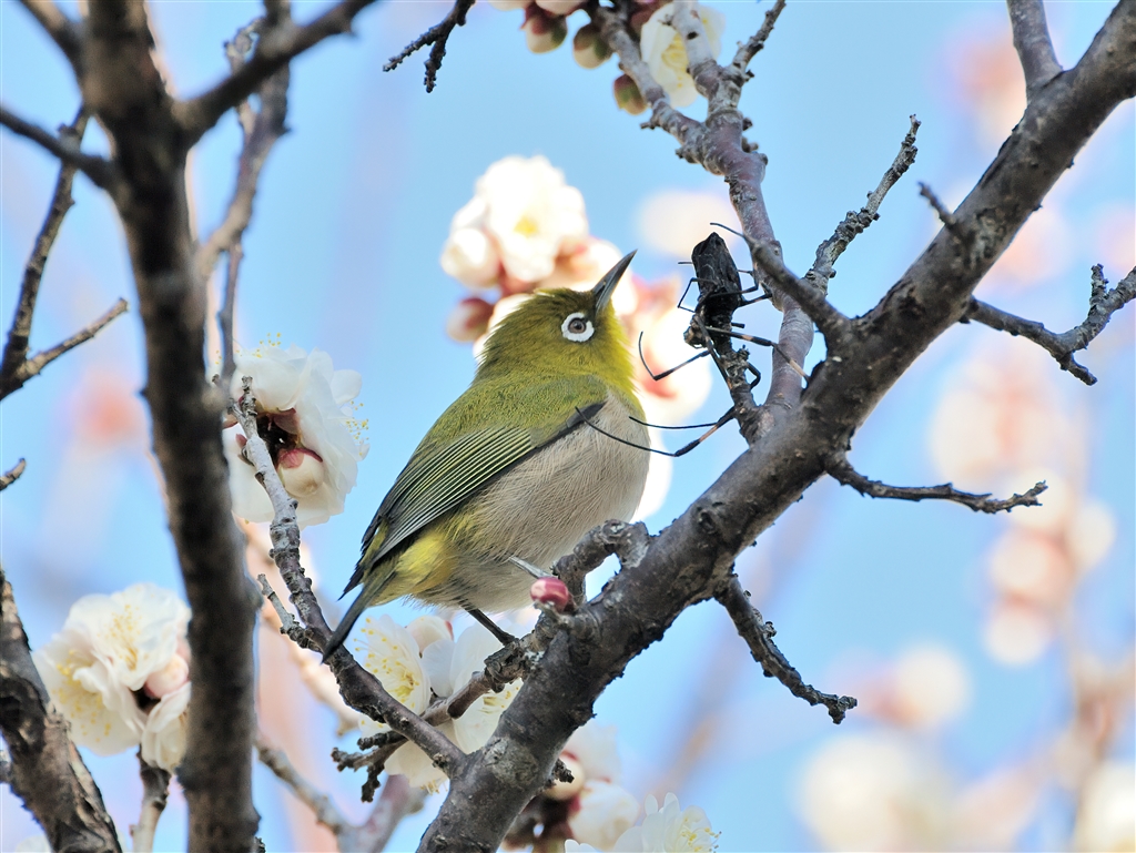 メジロの天敵モズがハヤニエした蜘蛛とメジロと白梅
