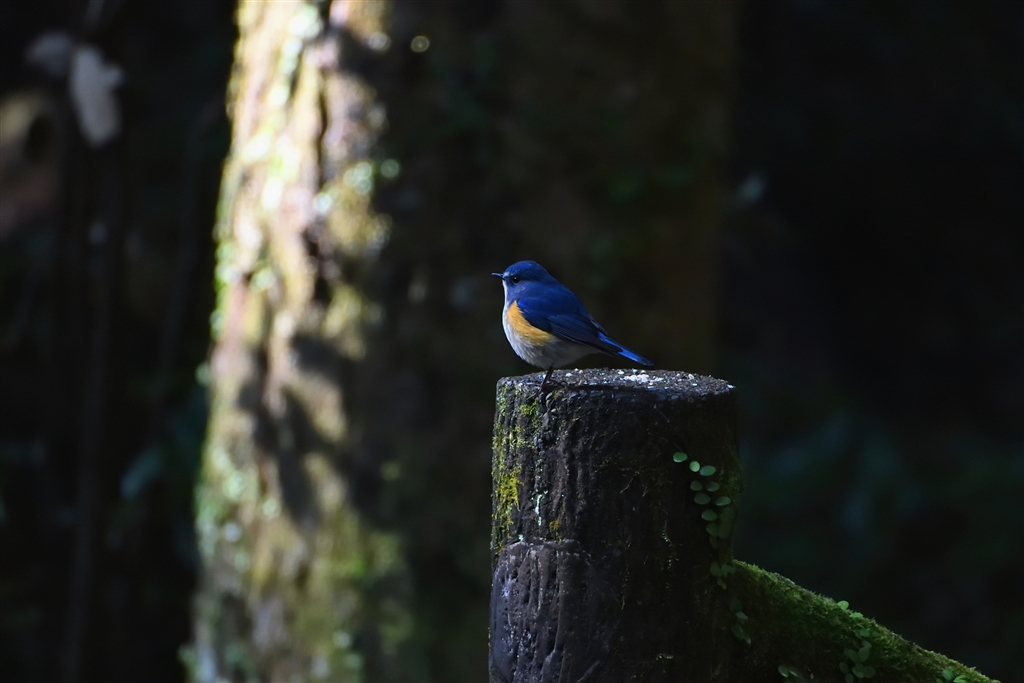木立の蔭の遠くにルリビタキが