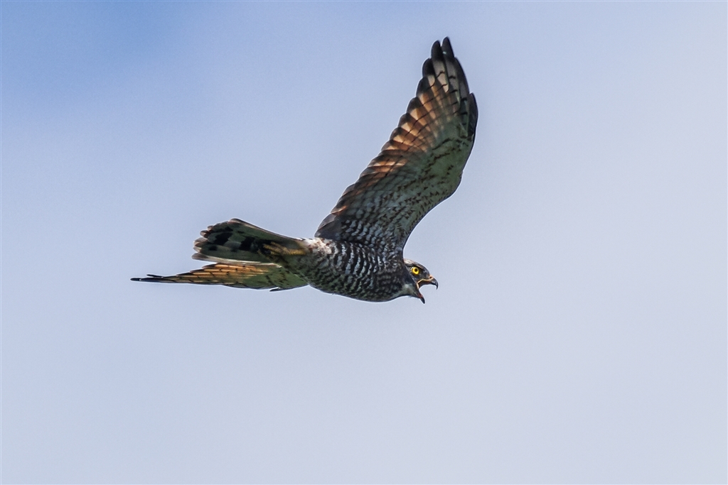 鳴きながら飛翔するサシバ