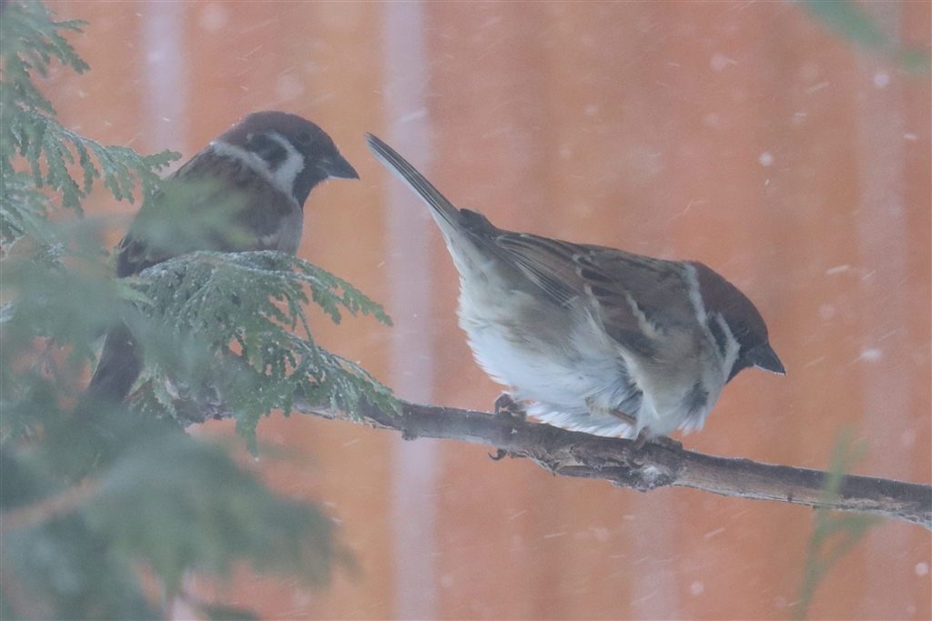 吹雪の中、餌場に来たスズメ。飛ばされそうです。