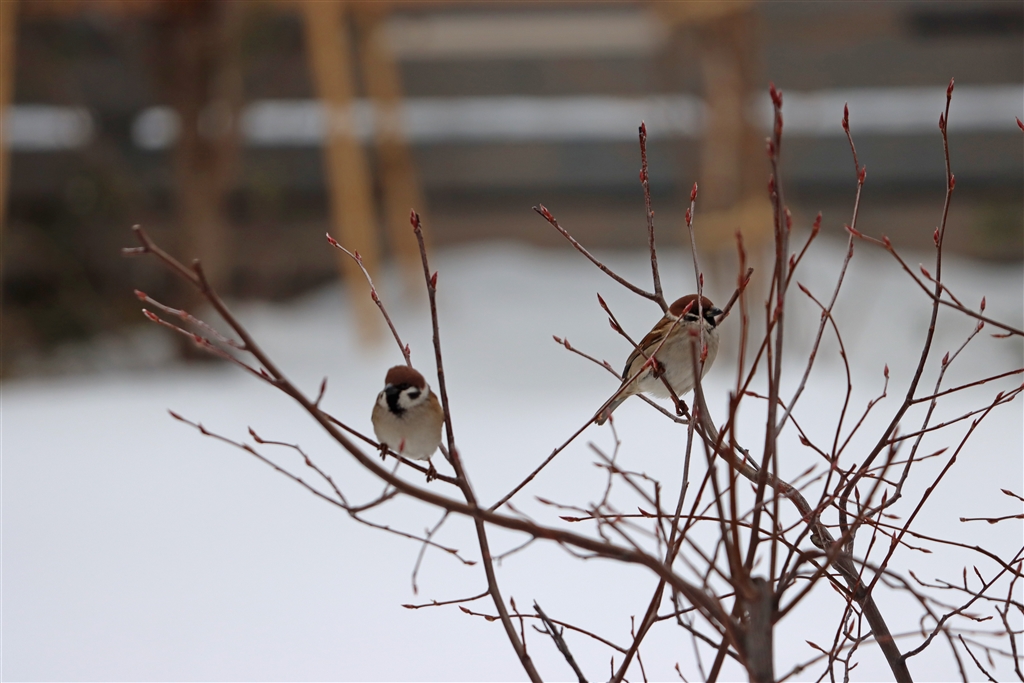 ジューンベリーの冬芽を撮っていたら、タイムリーにスズメがやってきました