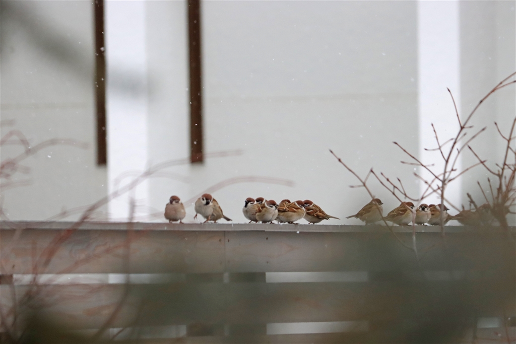 遠すぎてこんなですが、マイナス気温の中「塀の上で世間話する雀」