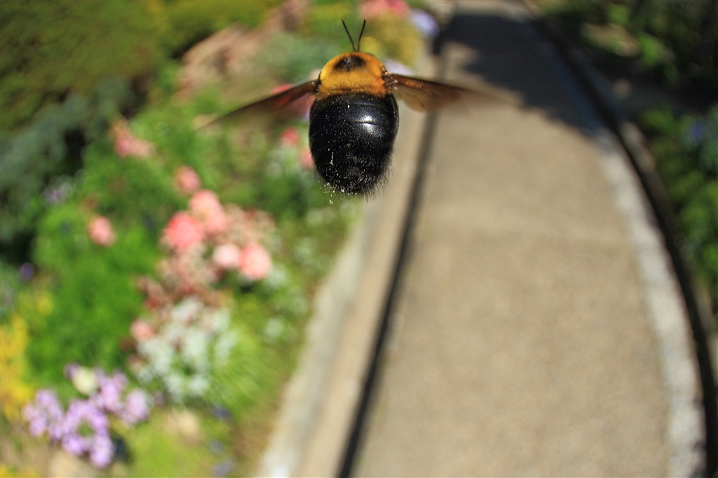 ブンブンと同じところを飛び回るクマバチ(大人しくて刺さない)