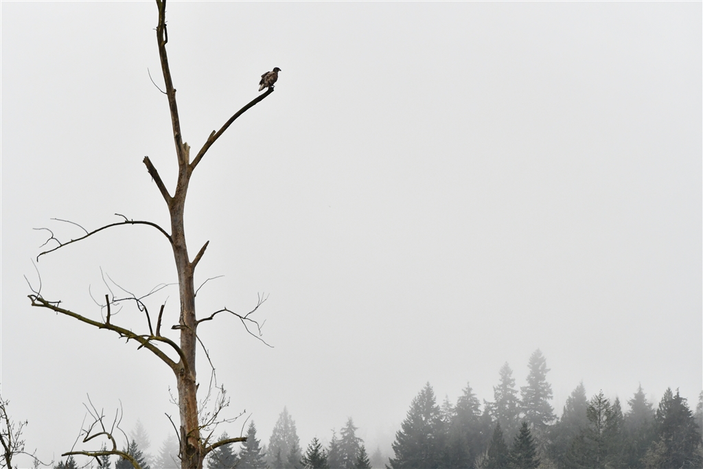 遥か彼方に豆粒(雨に耐えるハクトウ幼鳥)