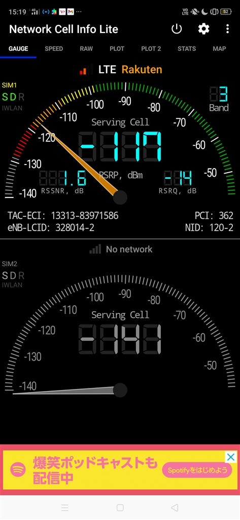 自宅前の道路の楽天回線電波強度