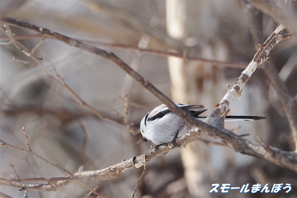 尺取り虫?を枝に打ち付けるシマエナガ