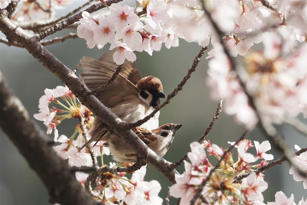 桜満開、スズメさんも春爛漫