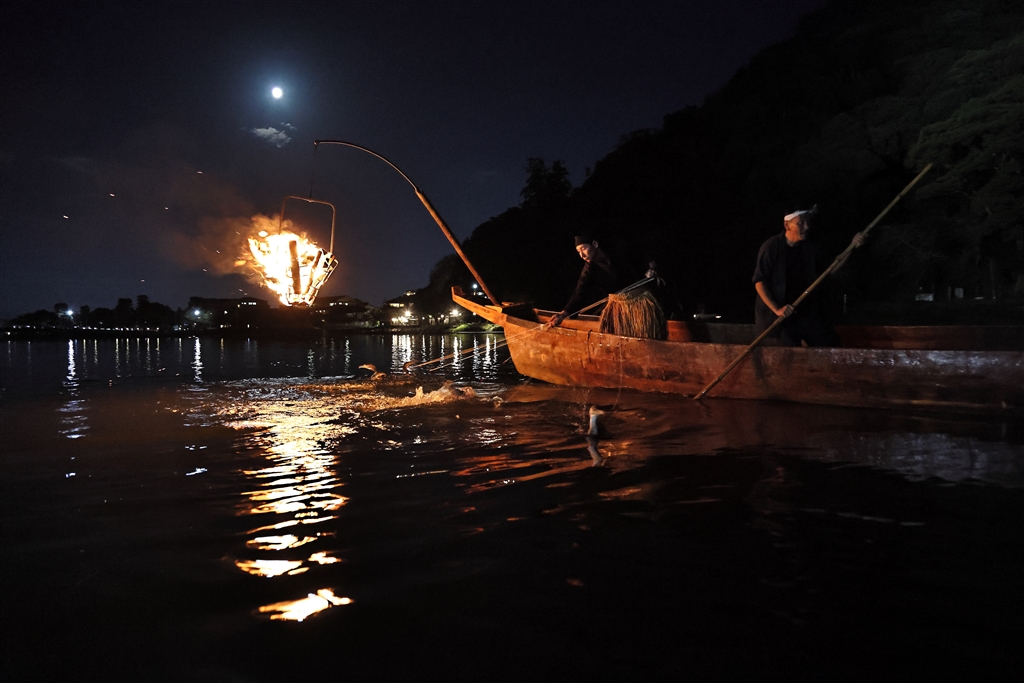 月明かりの中での鵜飼(昨夜はほぼ満月でした)