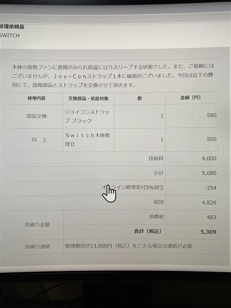 本体自体の修理は、500円