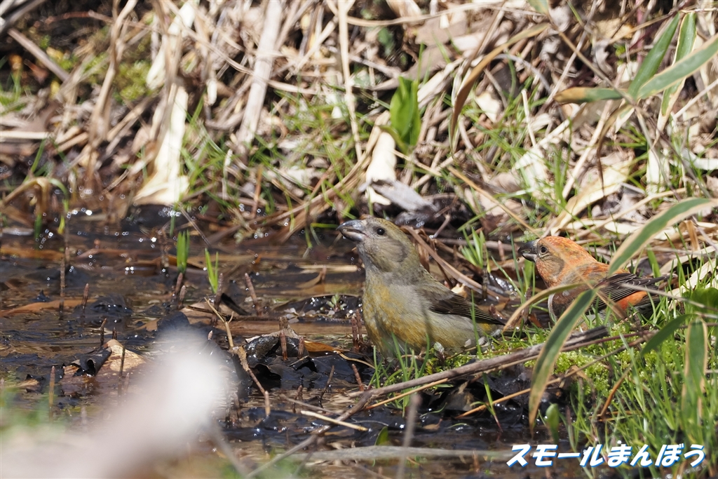 目立たない場所でコッソリ水飲み中のイスカ