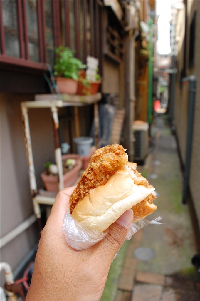 路地裏でとんかつパンをモグモグ