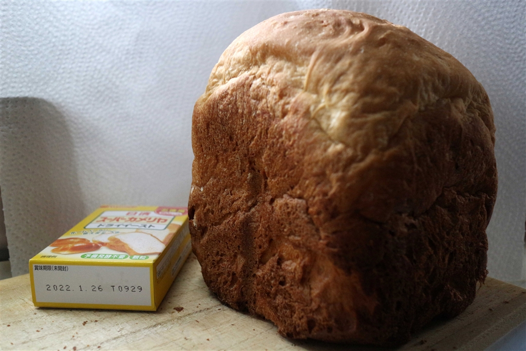 写真1:昨朝、使用したドライイーストと焼き上がった自家製メープル食パン