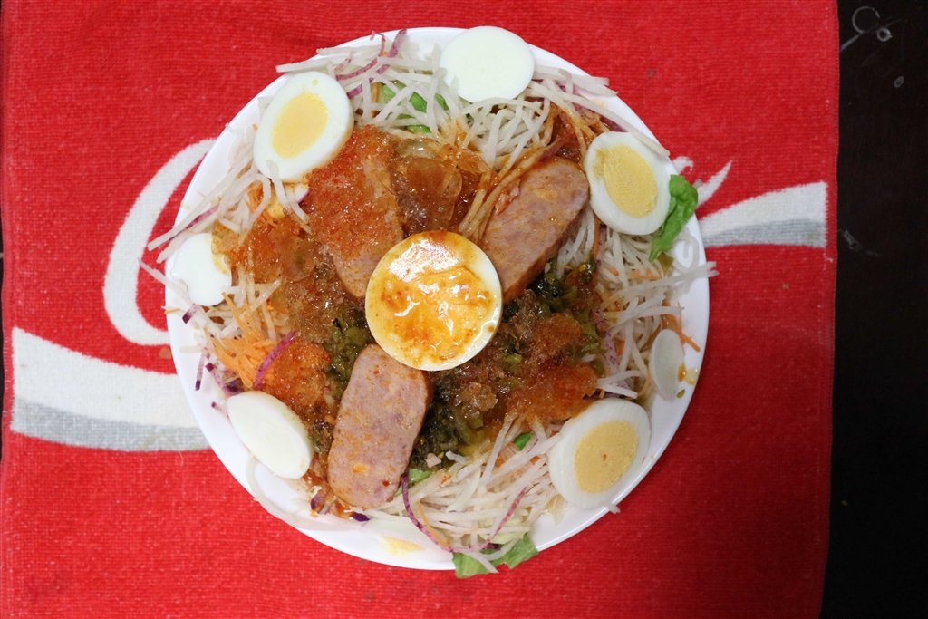 微細氷と水で薄めた激辛スープをかけ、完成した冷麺なのねん