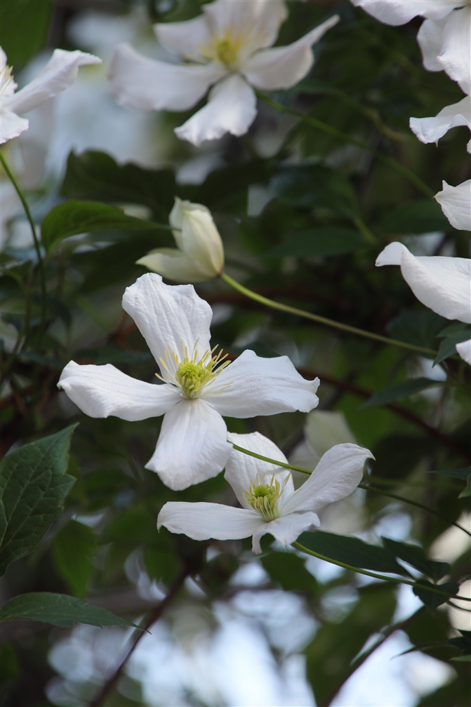 クレマチスで一番最初に咲くモンタナスプーネリーが満開です。