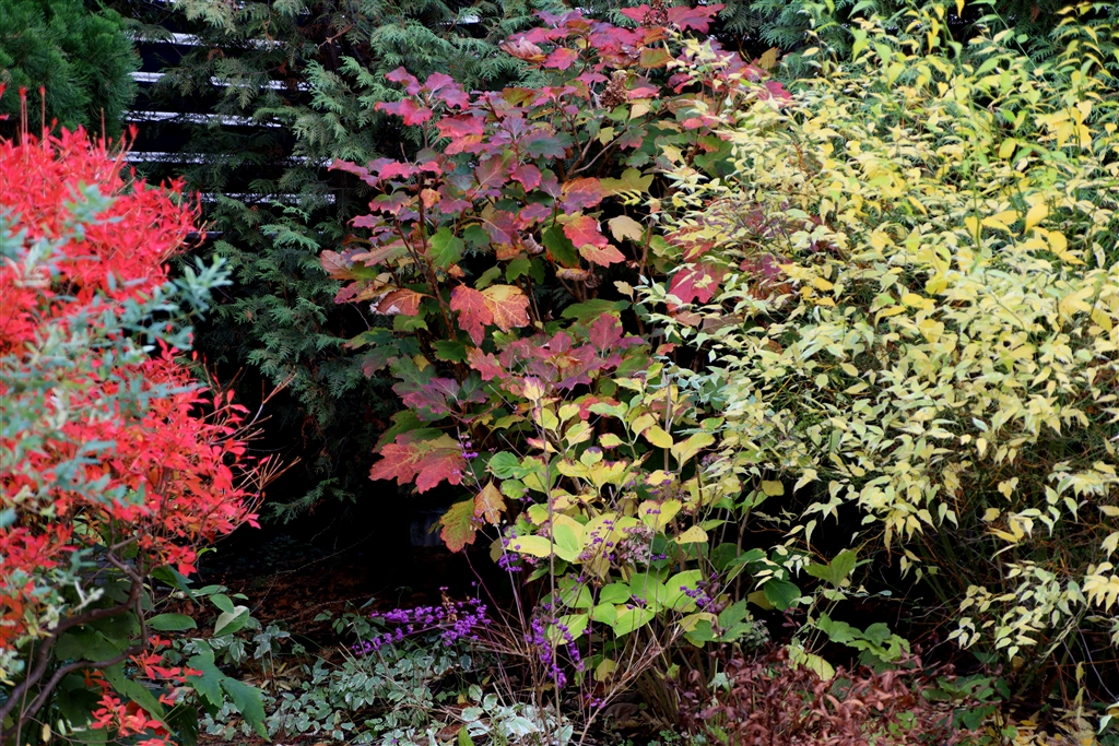 紅葉のドウダンツツジ、枯れ始めのヤマブキ(右手前)奥はカシワバアジサイ。