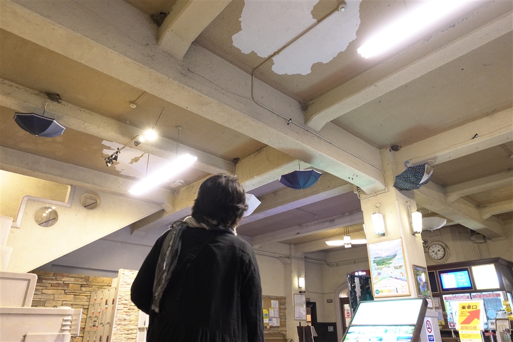 六甲ケーブル駅 傘の上はツバメの巣