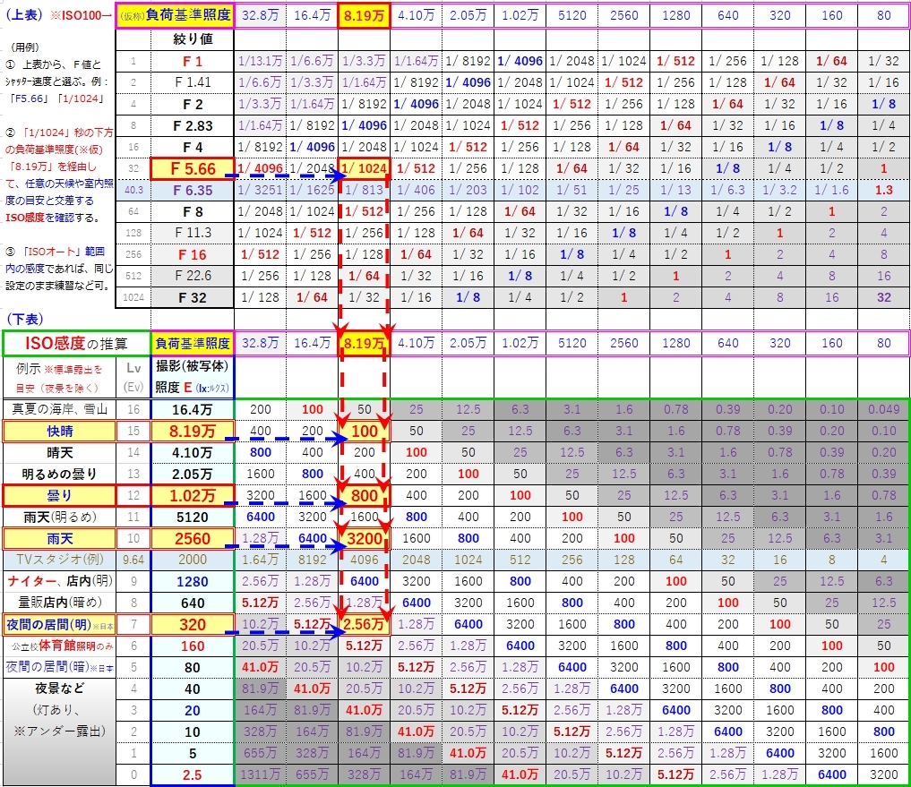 F値とシャッター速度⇒負荷基準照度⇒明るさ⇒ISO感度