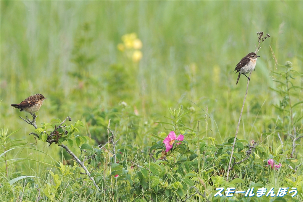 花絡みのノビタキ親子