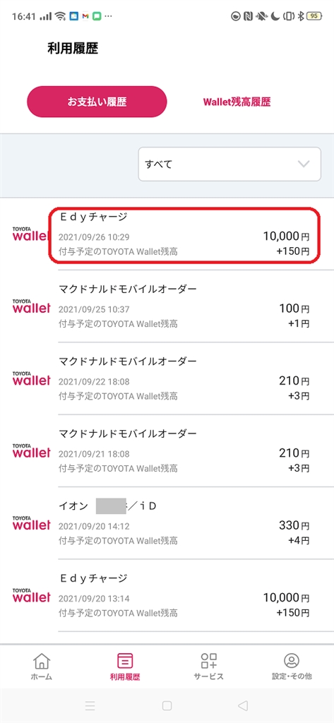 TOYOTA Walletから楽天Edyチャージ成功