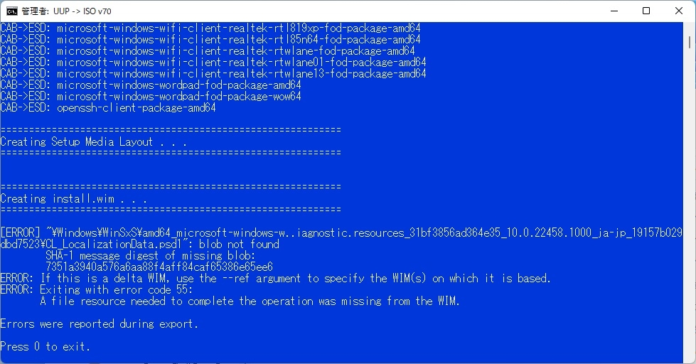 UUP dump 22458.1000 作成エラー