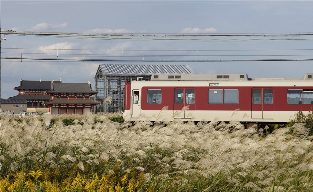 秋の平城京跡、向こうに見えるのが南門と大極殿