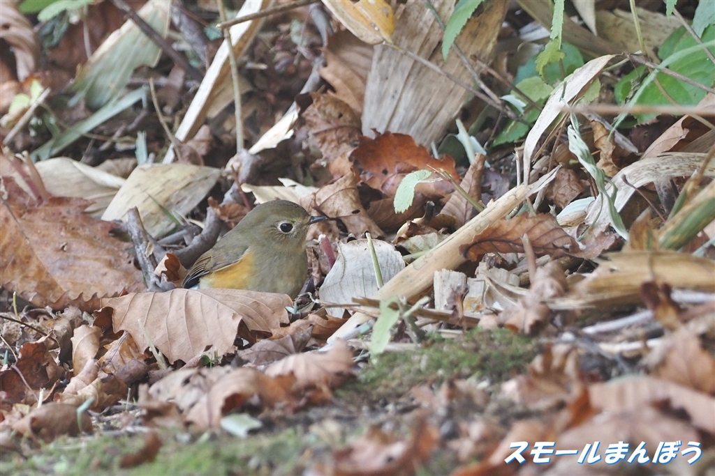 地面で餌探しのルリビタキ