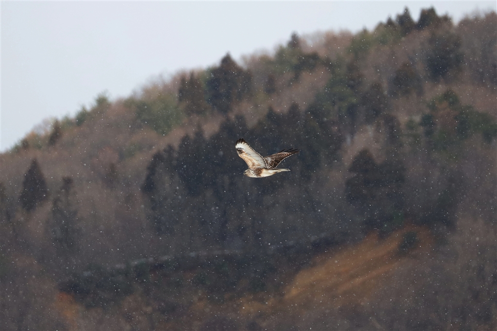 雪降る中を飛ぶノスリ