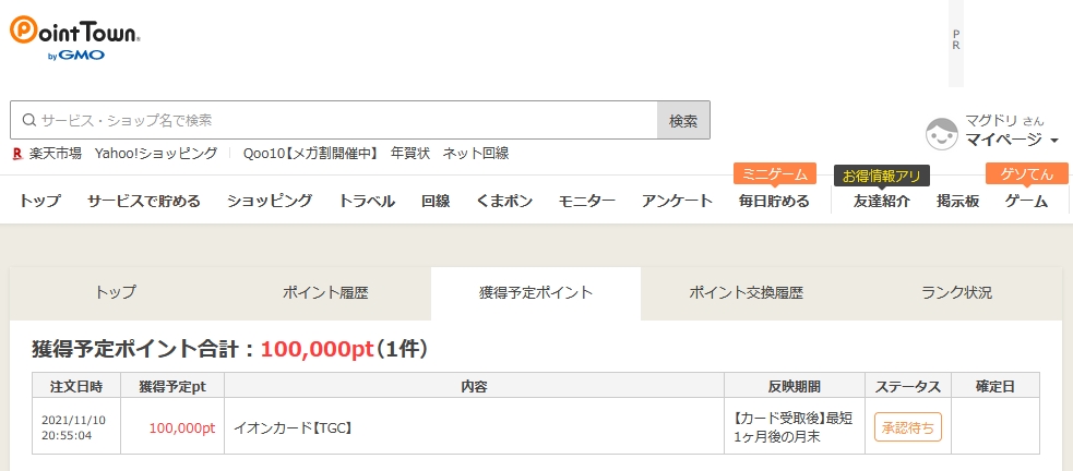 獲得予定ポイント合計:100,000pt