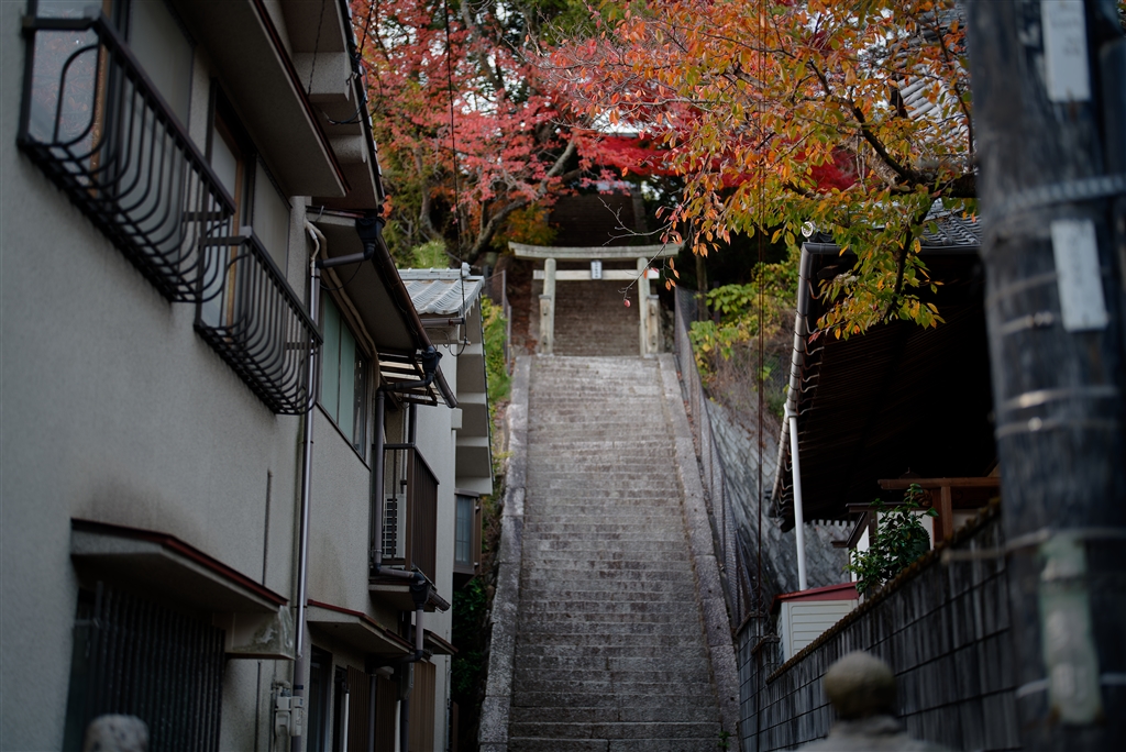 階段と紅葉。薄暗い時間帯でもF1.2でISOを引き上げることなく撮影できました。