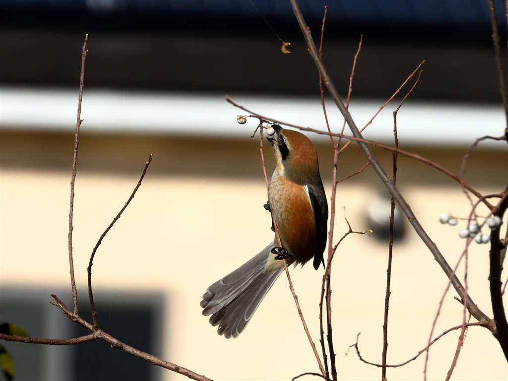 木の実に挑戦するもまったくうまくいかないモズ