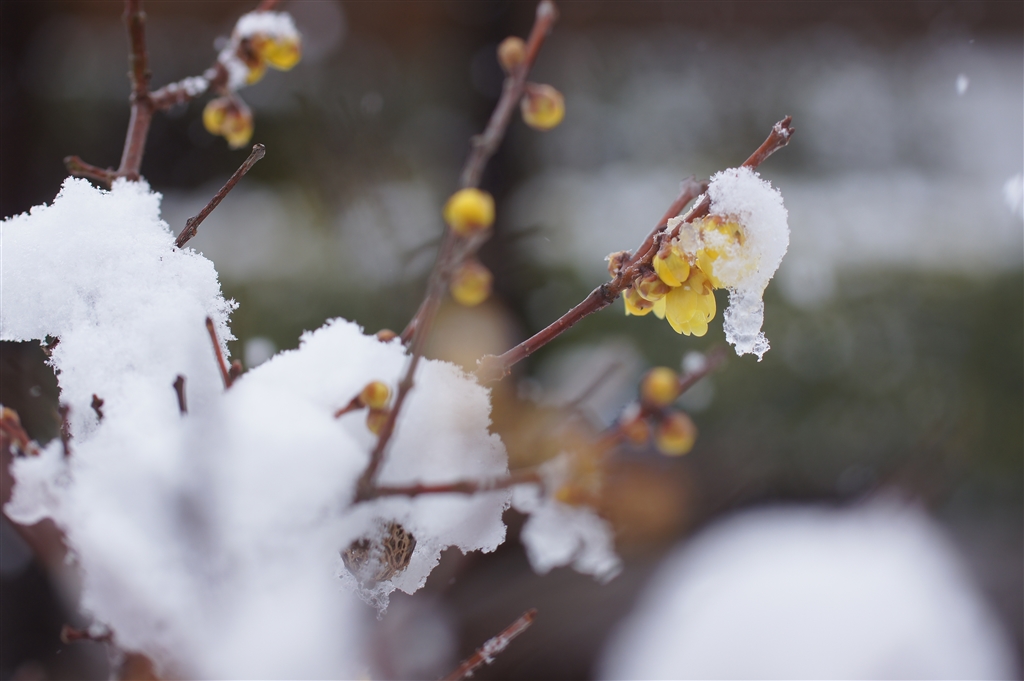 芦刈園に咲くロウバイの花…雪が積もる。