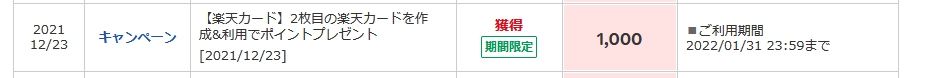 楽天カード2枚目1000P獲得!!