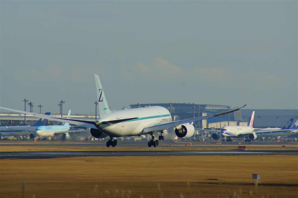 ZIPロサンゼルス発成田便、B787-9の着陸。滑走路に行列できてます。