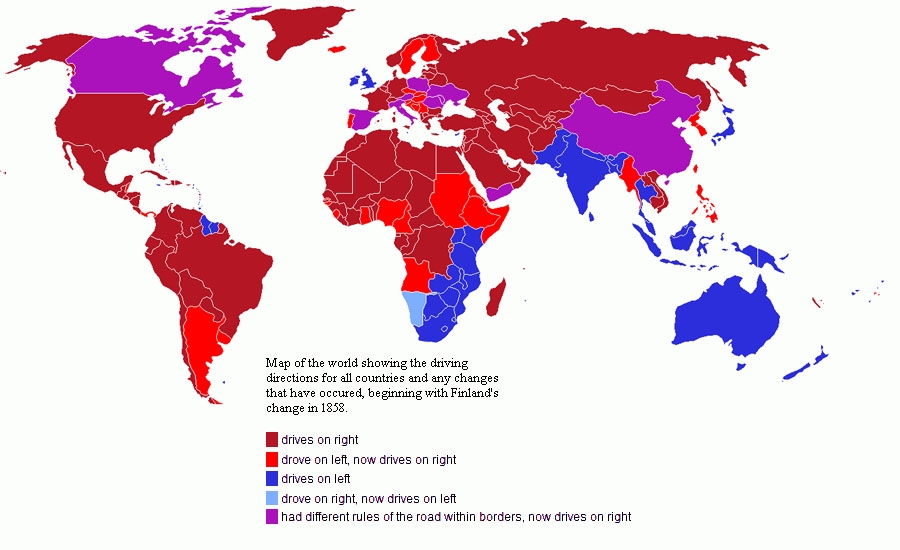 青と水色が左側通行の国
