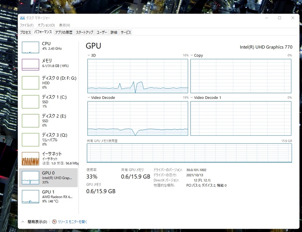 自分のYoutube再生時のタスクマネージャ