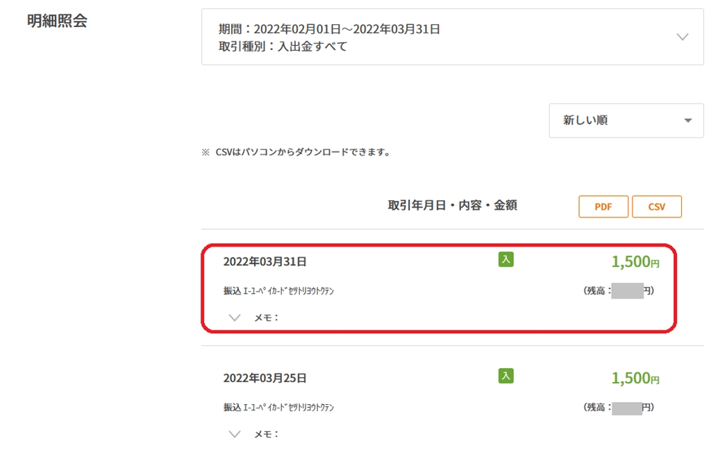 不足分1500円が今日入金されました。